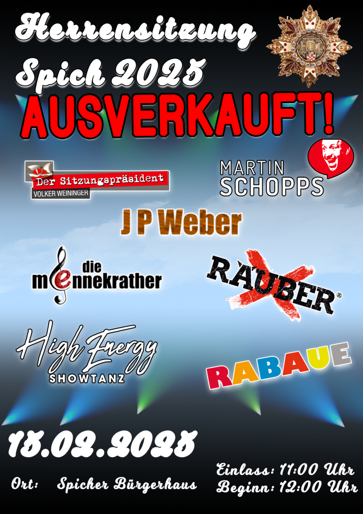 Seit mittlerweile über 30 Jahren richtet der Prinzenstammtisch Spich die Herrensitzung im Ort aus. Eine lange Tradition, die gepflegt wird. Unter der Leitung der Moderatoren Thomas Freyaldenhoven und Marcel Wagner wird auch im Jahr 2025 eine Sitzung stattfinden, mit einem Programm der Extraklasse.
